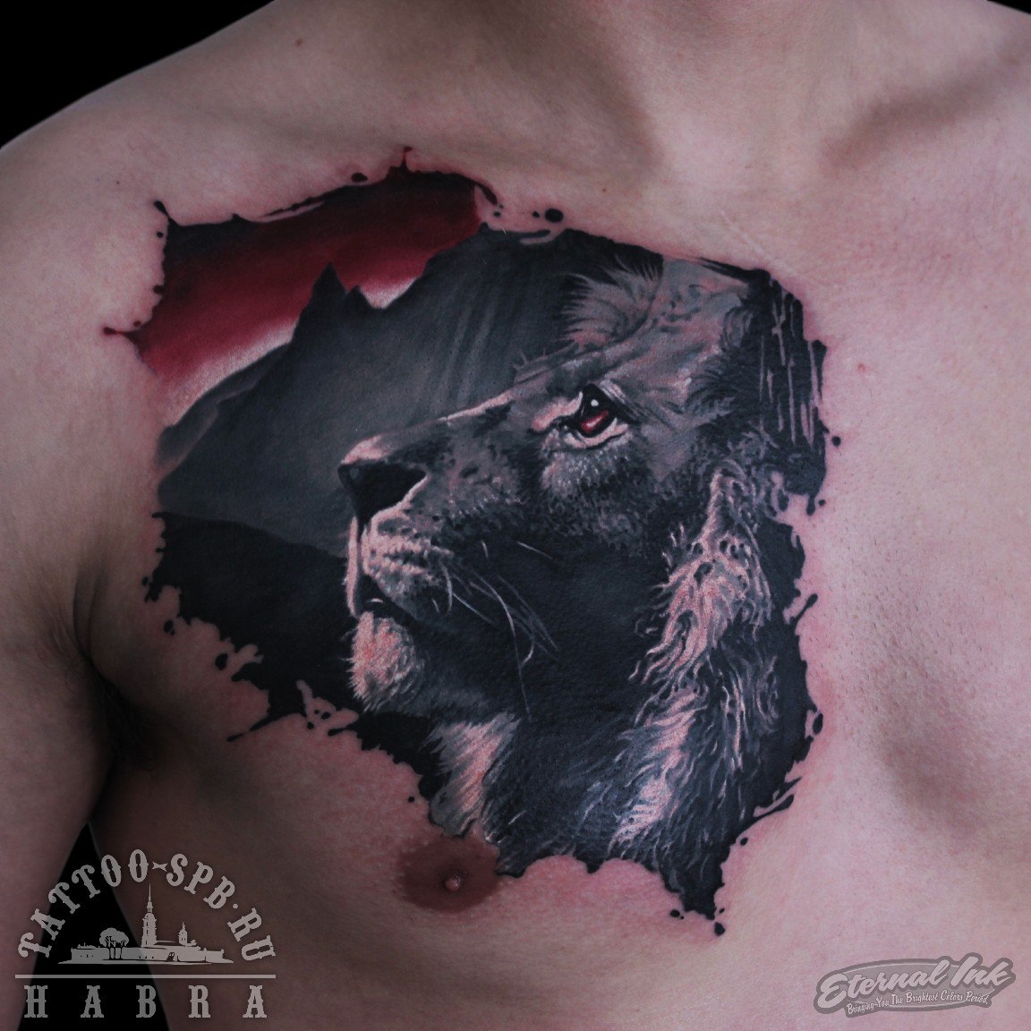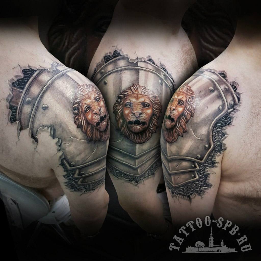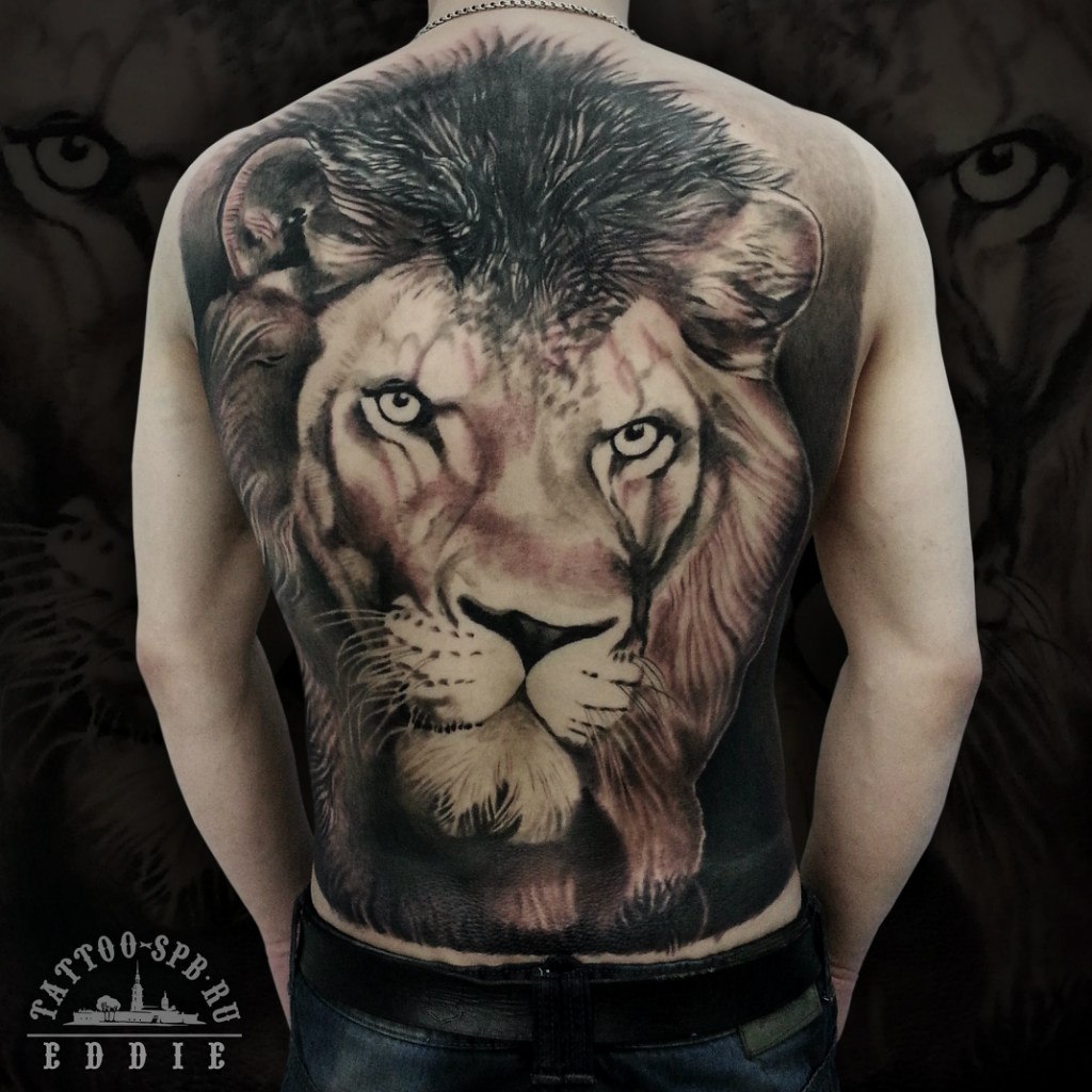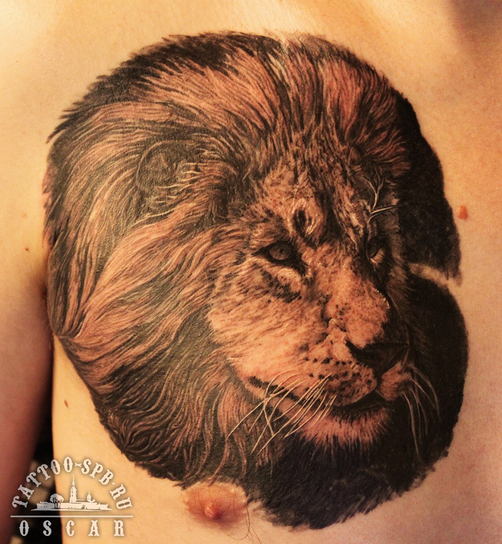 Высокая степень детализации и большой размер характерны для татуировок со львом. «Короля зверей» обычно изображают на плече, груди, руке или спине: