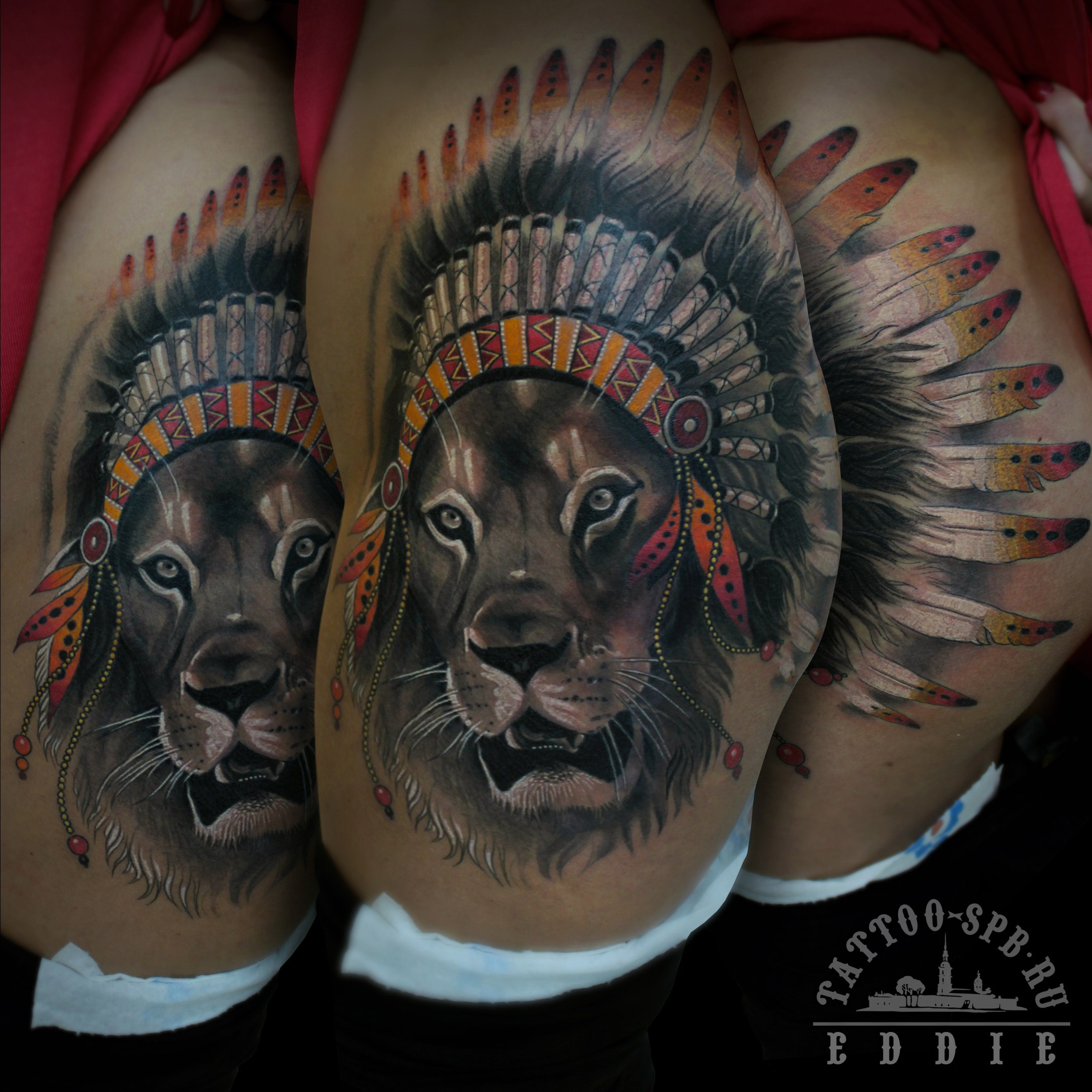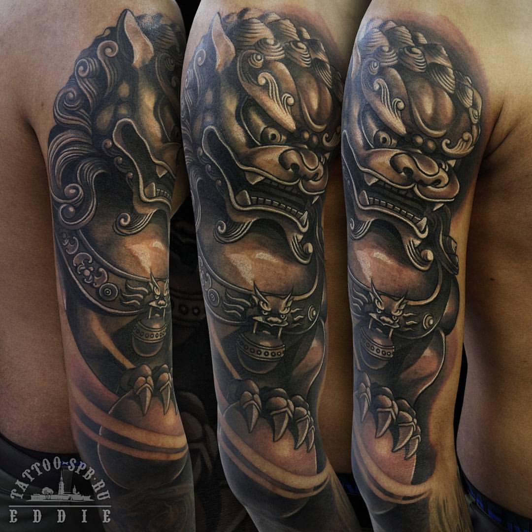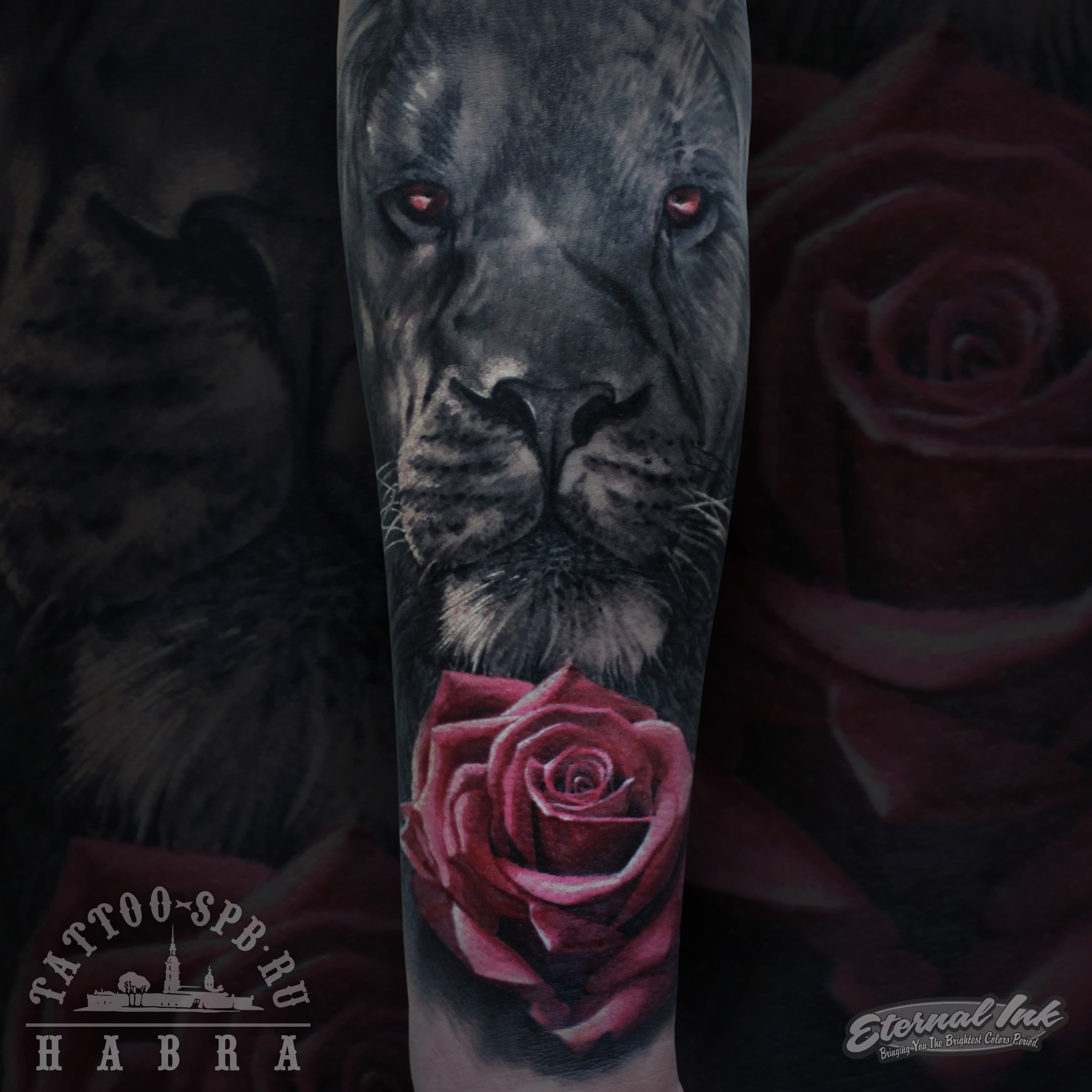 Высокая степень детализации и большой размер характерны для татуировок со львом. «Короля зверей» обычно изображают на плече, груди, руке или спине: